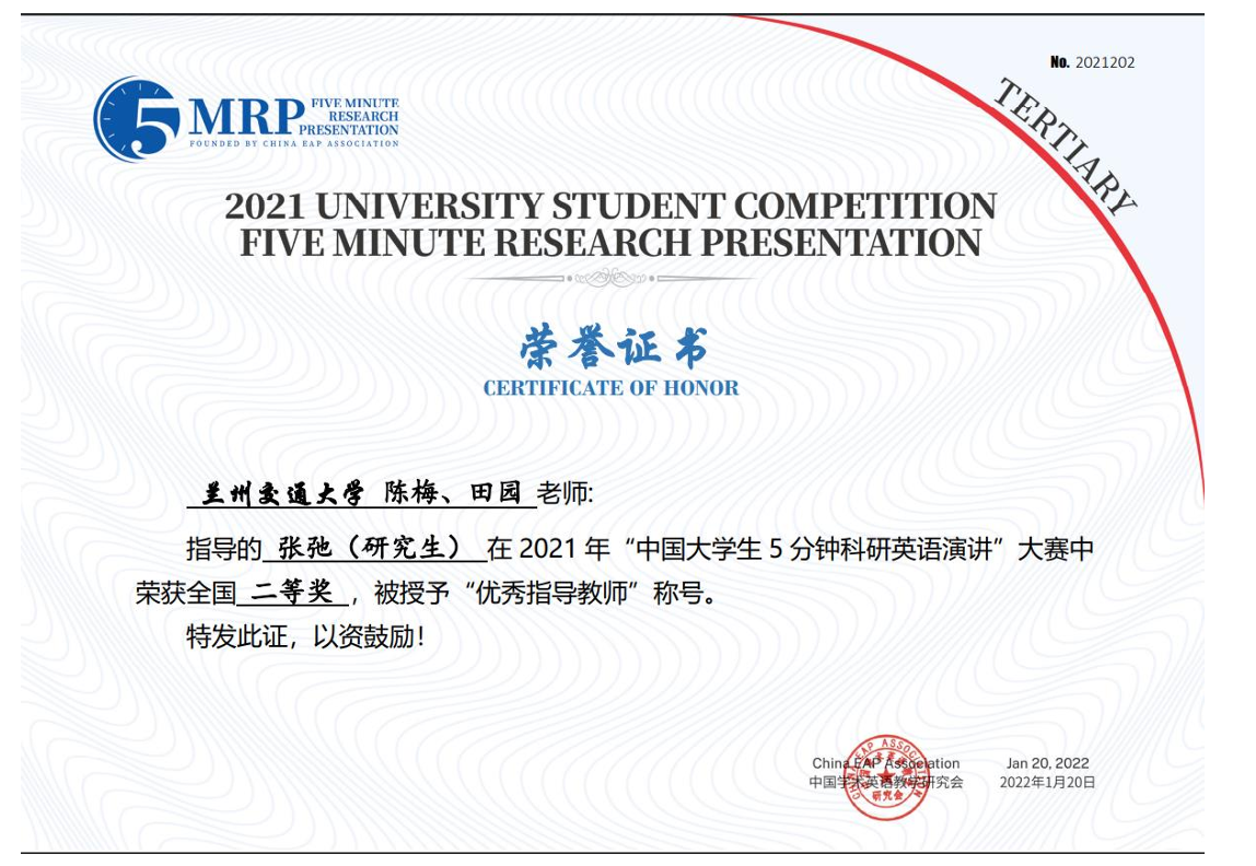 备注:指导硕士研究生张弛荣获2021年“中国大学生5分钟科研英语演讲”全国二等奖